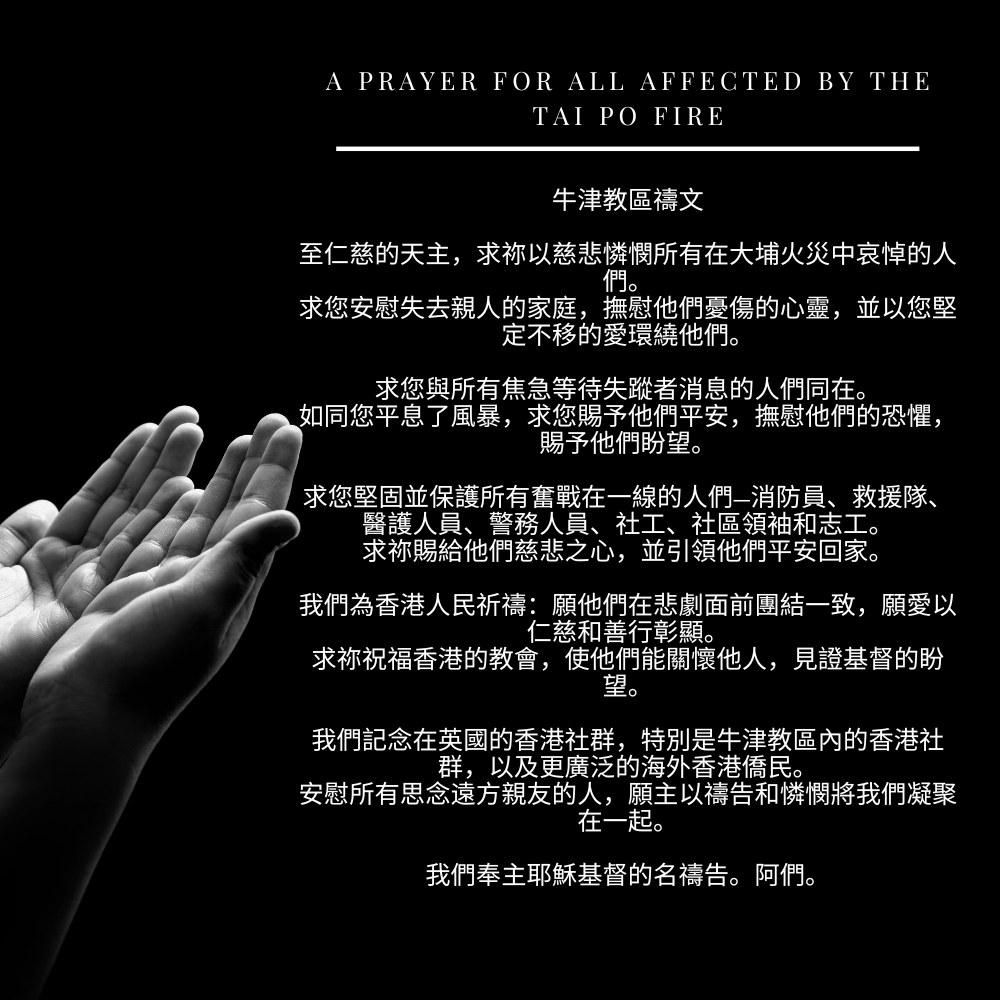 “Our thoughts and prayers are with all those affected by the tragic and deadly fire in Wang Fuk Court in Tai Po, Hong Kong. We know this will affect many across our diocese in particular our sisters and brothers who have recently left Hong Kong to settle in Berkshire and elsewhere in the diocese. Please know that we stand with you and are praying for you and families and friends.”