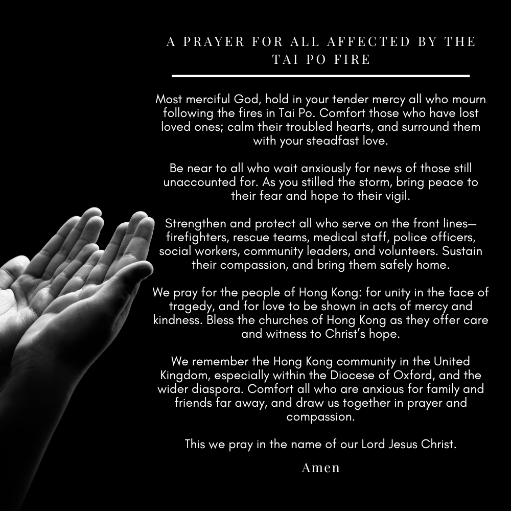 “Our thoughts and prayers are with all those affected by the tragic and deadly fire in Wang Fuk Court in Tai Po, Hong Kong. We know this will affect many across our diocese in particular our sisters and brothers who have recently left Hong Kong to settle in Berkshire and elsewhere in the diocese. Please know that we stand with you and are praying for you and families and friends.”